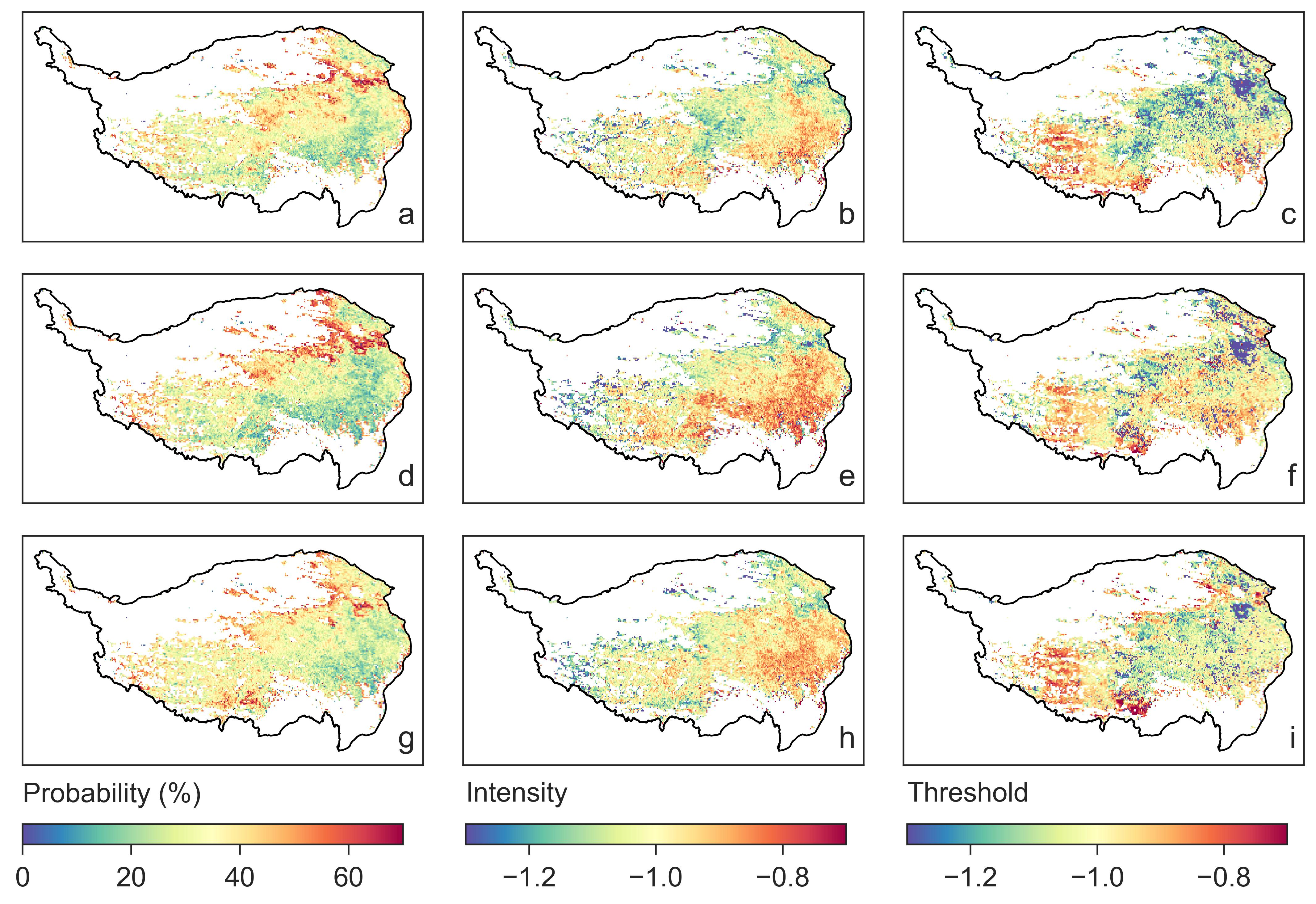 图2 青藏高原草地在前期(a–c)、中期(d–f)和后期(g–i)三个阶段中净初级生产力受干旱影响趋势的空间分布