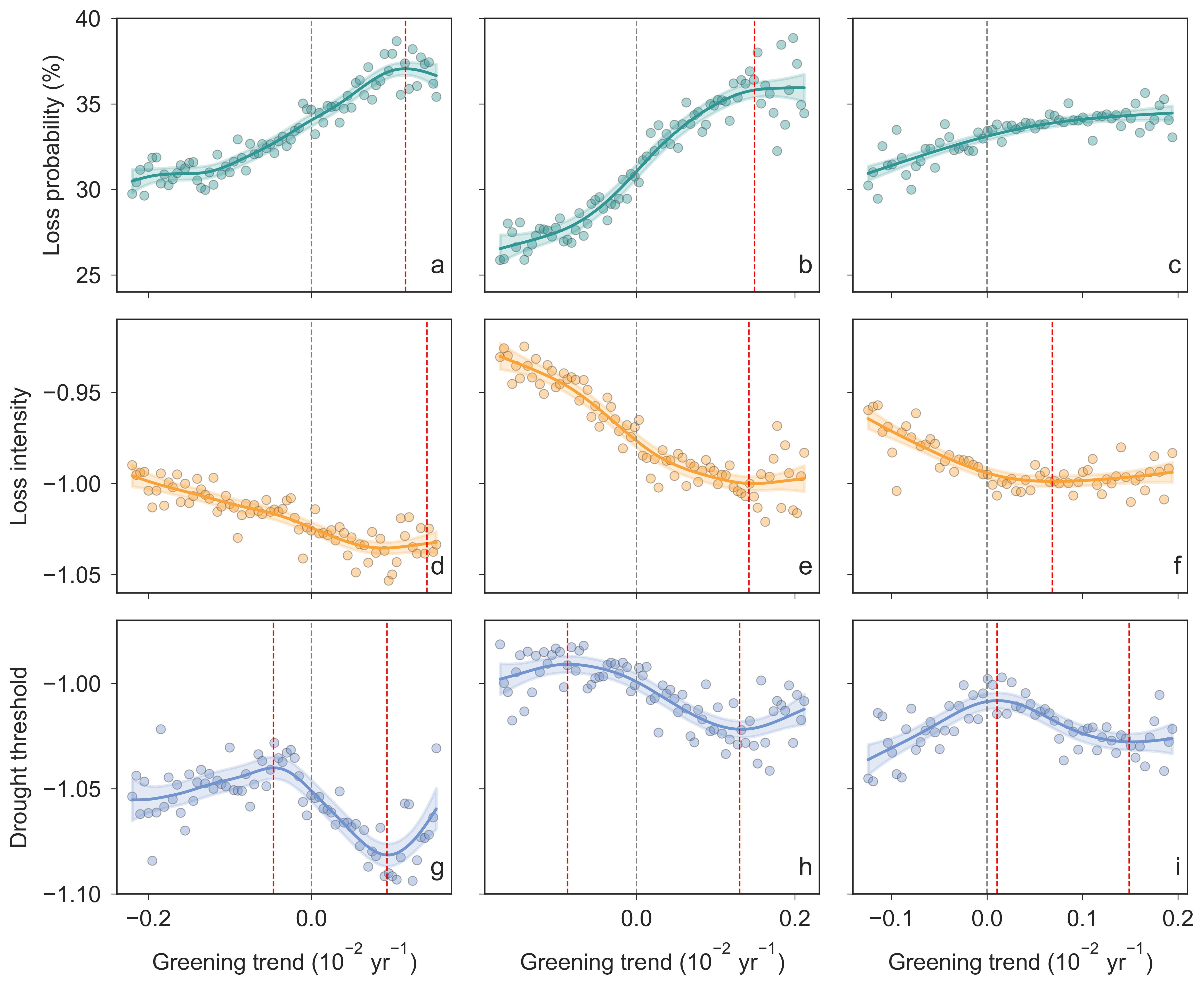 图3 青藏高原草地在前期(a, d, g)、中期(b, e, h)和后期(c, f, i)三个阶段中绿化程度与干旱损失概率(a-c)、平均损失强度(d-f)和干旱影响阈值(g-i)的关系