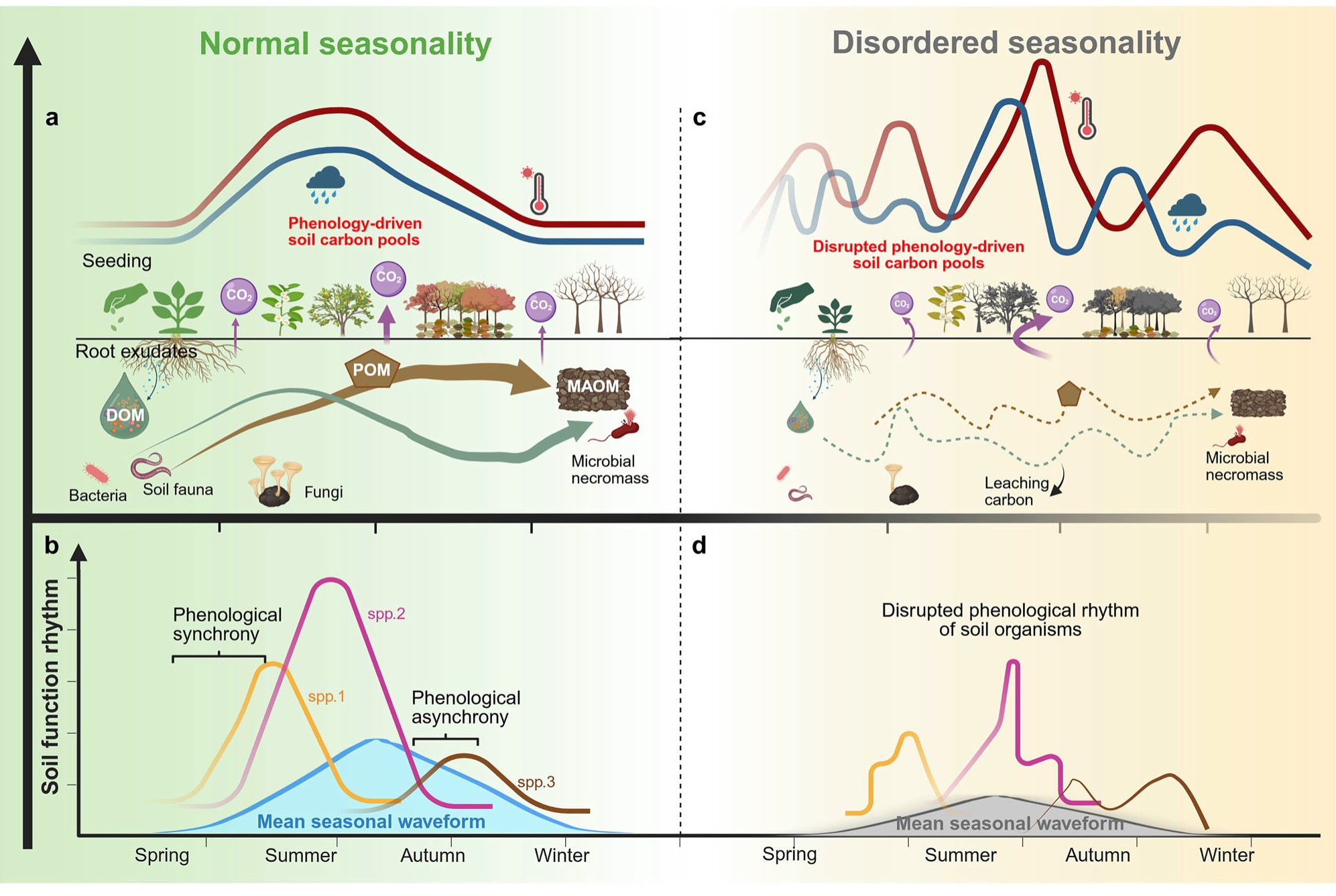图-1气候驱动的季节性物候紊乱可能削弱土壤碳的持久性:(a)在正常季节条件下,地上与地下生物之间协调的物候节律调节着碳输入、微生物转化过程以及持久性矿物结合有机质的形成。土壤动物(如蚯蚓)示意性地代表了参与土壤碳转化的关键功能类群。DOM,溶解性有机质;POM,颗粒有机质;(b)土壤生物(例如,物种1-3)在不同季节表现出独特的物候活动模式,对土壤功能节律的贡献各不相同。平均季节波形反映了由多个类群产生的综合信号;(c)在季节秩序紊乱的情况下,气候变化破坏了这种同步性。植物、微生物和动物物候活动在时间和强度上的变化,可能导致碳输入与微生物需求脱节,分解连续过程碎片化,并改变营养级相互作用,最终降低土壤碳持久性和生态系统恢复力;(d)此类紊乱通过改变土壤生物的物候模式,可能使土壤功能节律趋于平缓并破坏其同步性。