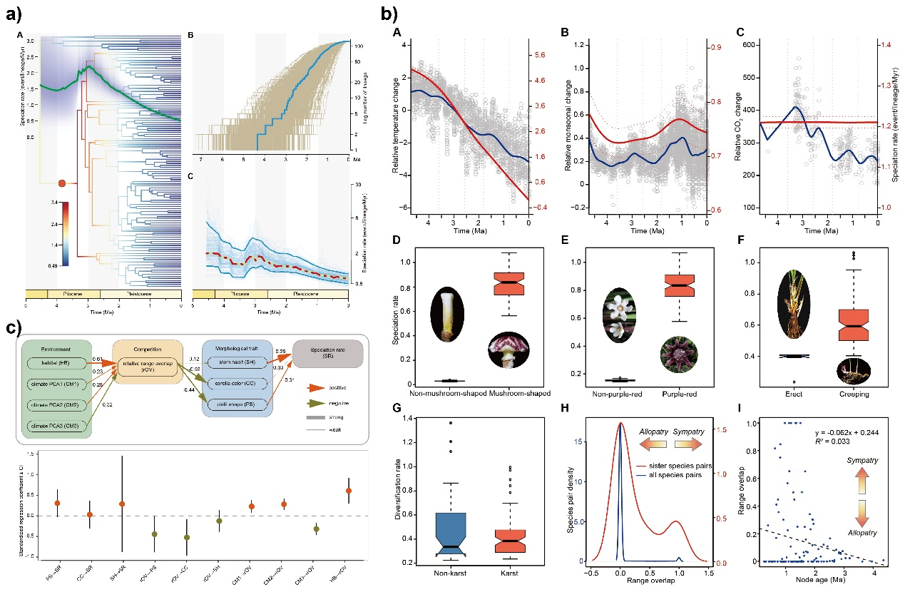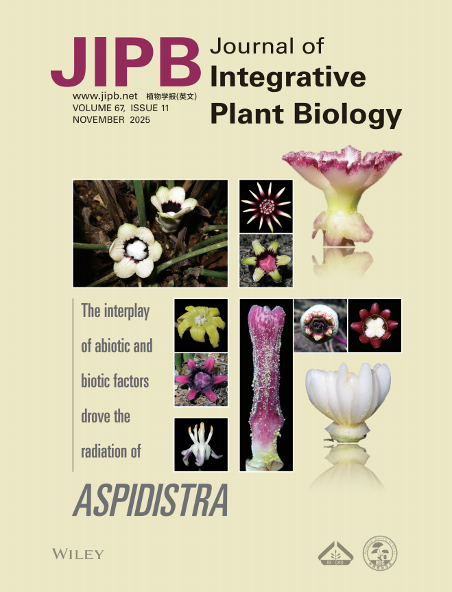 近期,Journal of Integrative Plant Biology (JIPB) 杂志正式发表了中国科学院华南植物园鼎湖山站康明研究员团队和广西壮族自治区中国科学院广西植物研究所林春蕊研究员合作的研究论文“The interplay of abiotic and biotic factors likely drove one of the fastest plant radiations from tropical-subtropical Asia”被选为了杂志当期的封面故事(图1)。该研究通过对123种蜘蛛抱蛋属物种进行了简化基因组测序,并重建该属迄今取样最多、分辨率最高的系统发育树。基于该稳健的系统发育框架,研究团队估算了该属的分化时间,并基于多种方法分析了该属物种形成速率演化动态。结果显示蜘蛛抱蛋属为一个年轻的类群,其起源于中新世和上新世的边界期(5.49 Ma;95% HPD: 3.8–7.57 Ma),在上新世暖期(Mid Piacenzian Warm Period; 2.6–3.6 Ma)其物种分化速率显著加快,达到2.27个物种/百万年(图2a)。这一物种形成速率超过旧世界植物区系中所有已报道的物种形成速率。这也预示着蜘蛛抱蛋属代表着旧世界植物区系中物种分化速率最快的类群之一。研究团队进一步利用多种统计模型解析了蜘蛛抱蛋属物种快速分化的驱动力,发现包括古温度、东亚季风变化、物种竞争及传粉共生等多种生物与非生物因素可以同时独立又协同地促进蜘蛛抱蛋属的物种形成及快速辐射(图2b,c)。