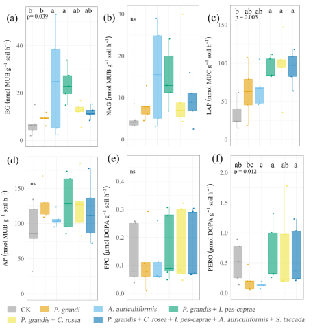 该研究依托长期观测样地,分析了不同植被恢复模式下(无植被、单一种植和混合种植)的土壤酶化学计量特征,并运用酶化学计量和矢量模型解析了土壤微生物代谢限制状况。研究发现,热带珊瑚岛土壤养分是调控微生物代谢限制的主导因素,微生物代谢主要受碳(C)和氮(N)可利用性的强烈限制,而磷(P)并非限制因子。尤为关键的发现是,单一种植模式(如抗风桐,Pisonia grandis)比混合种植模式更能适应养分限制的岛礁环境。