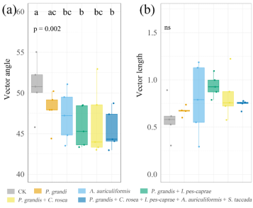 图2 热带珊瑚岛不同植物种植模式下酶矢量特征