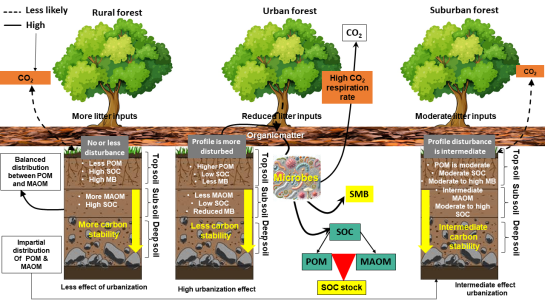 全球变化下,该文章综述了城市化进程如何在城乡梯度上影响森林土壤有机碳(SOC)稳定性,重点分析了与稳定性相关的物理、化学和生物学指标。研究表明,与郊区森林(Suburban forests)和乡村森林(Rural forests)相比,城市森林(Urban forests)土壤有机碳稳定性显著降低,尤其是稳定性物理学组分——矿物结合有机碳(MAOC)的减少。SOC化学稳定性在郊区森林土壤中表现更优,这类土壤通常积累更多不易氧化有机碳,有利于长期碳固存。微生物量碳等生物学指标在城市森林中普遍下降,特别是在凋落物和根系输入减少的受干扰区域,而介导碳循环的酶活性沿城乡梯度呈现出明显的波动。城市化可通过营养富集和物理扰动增加微生物(尤其是细菌)分类学多样性,但土地压实或污染会导致微生物丰度下降,这可能会限制微生物介导的SOC稳定过程。
