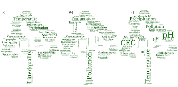 图3 在城乡梯度上影响土壤有机碳稳定性的关键因素:农村森林(a)、郊区森林(b)和城市森林(c)