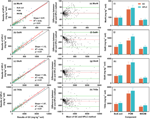 注:a–d,基于 395 份土壤样品,GC 与 HPLC 在单个氨基糖及总氨基糖浓度上的线性相关关系。红线表示回归斜率,黑色虚线表示 1∶1 参考线(所有组分的 R² 均大于 0.92)。e–h,Bland–Altman 一致性分析图,展示 GC 与 HPLC 两种方法之间的差异与一致性。红色虚线表示平均偏倚,绿色实线表示 95% 一致性限,结果表明两种方法整体高度一致,仅存在轻微的系统性偏差。i–l,GC 与 HPLC 在整体土壤、颗粒有机质(POM)和矿物结合有机质(MAOM)中测得的单个氨基糖及总氨基糖平均浓度(均值 ± 标准误)。MurN:胞壁酸;GalN:胺基半乳糖;GluN:胺基葡萄糖;TASs:总氨基糖。