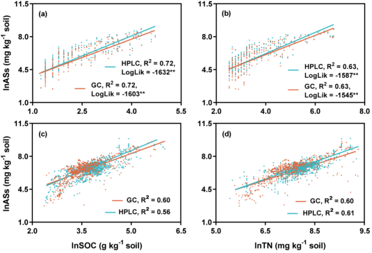 注:a–b,基于 395 份土壤样品,ln 转换后的土壤有机碳(SOC;a)和全氮(TN;b)与氨基糖(ASs)浓度之间的关系对比,其中 GC 测定结果用红色表示,HPLC 测定结果用蓝色表示。在 SOC 和 TN 含量较高的土壤中,GC 方法表现出更高的对数似然值(LogLik),表明其模型拟合显著优于 HPLC(似然比检验,p < 0.001)。c–d,基于已发表研究汇编数据的对数–对数回归分析,展示 SOC(c)和 TN(d)与 ln 转换后的氨基糖浓度之间的关系(GC:n = 800;HPLC:n = 1100)。