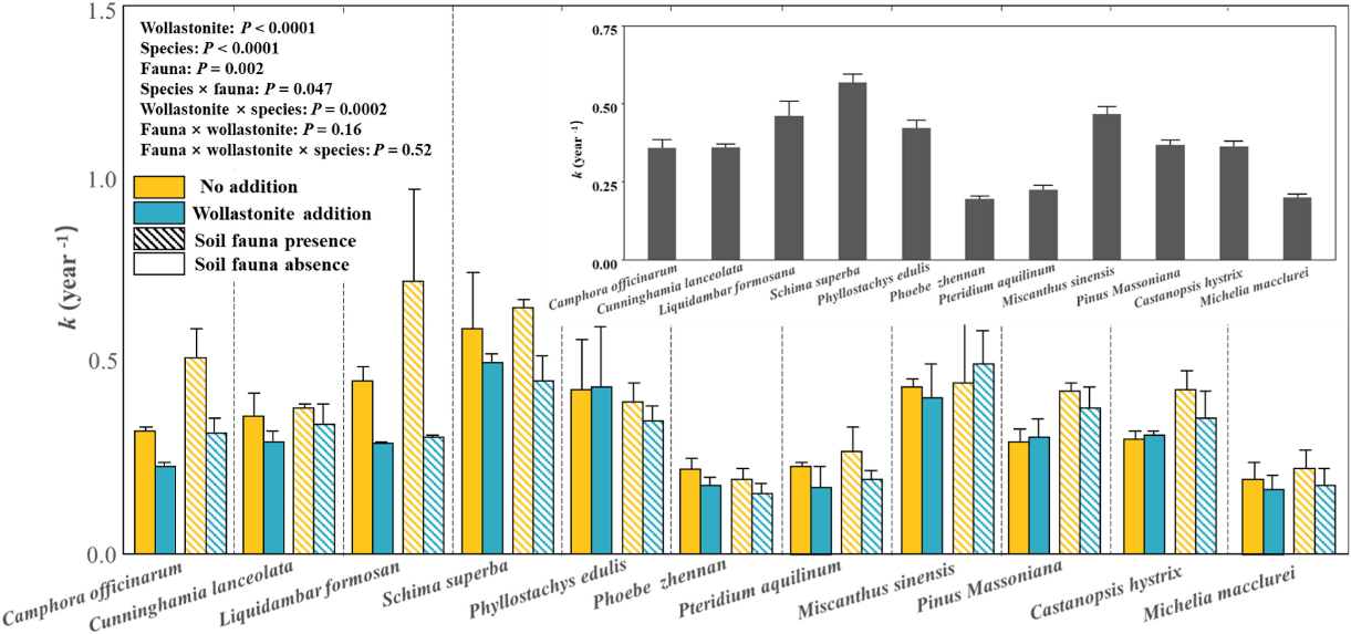 针对这一科学问题,中国科学院会同森林生态实验站以亚热带森林为研究对象,开展了为期一年的野外凋落物分解实验。研究人员在土壤表面施加硅灰石粉末(5吨/公顷),并采用两种孔径的凋落物袋(0.1毫米与2毫米)分别排除或允许土壤动物进入,系统研究了硅灰石添加对11个树种凋落物分解的影响及其调控机制。