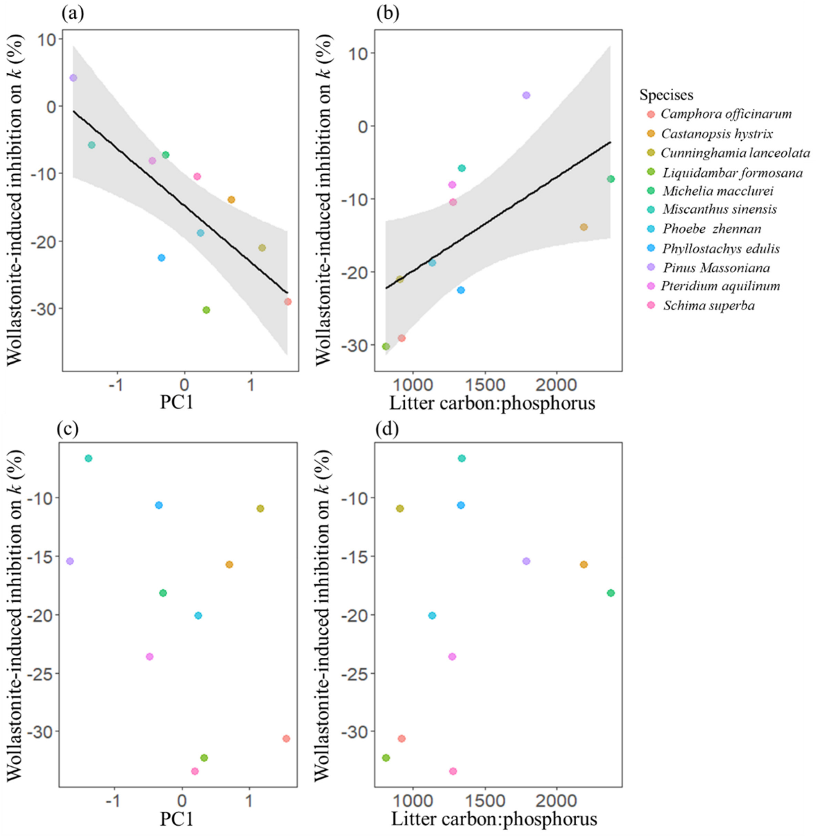 图2. 硅灰石粉末添加对凋落物分解的抑制作用及其与凋落物质量的关系