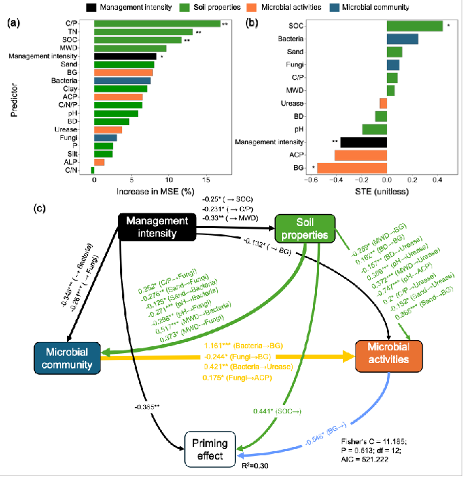 针对这一科学问题,中国科学院会同森林生态实验站、中国科学院大学联合欧洲多国科研机构,依托欧洲长期定位试验(LTEs)网络,系统开展了跨环境梯度的土壤激发效应研究。研究团队对覆盖三种主要气候类型的8个LTEs站点进行采样,根据耕作强度和受肥类型将土壤划分为四种管理强度水平,通过13C同位素示踪技术量化了不同管理背景下的激发效应强度。研究结果表明,激发效应可以有效预测欧洲及全球尺度农田的土壤碳含量。不同强度的农业管理显著改变了激发效应的大小与方向:低强度管理(如施用有机肥、减耕或免耕)显著增强了土壤的正激发效应,其PE平均值可达10.63±2.57至11.43±5.10 μgCg-1soil;而高强度管理(如单施化肥、常规耕作)则导致PE显著降低,甚至出现负激发效应,其平均值仅为3.18±1.36 μgCg-1soil。进一步解析显示,管理强度不仅直接通过改变SOC含量影响PE,还通过调节土壤团聚体稳定性和微生物生物量(细菌、真菌)产生间接影响。随机森林和结构方程模型分析确认,C/P比、SOC、全氮以及β-葡萄糖苷酶活性是激发效应的关键预测因子。