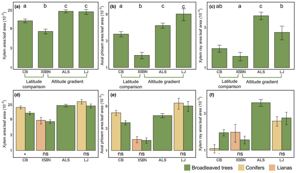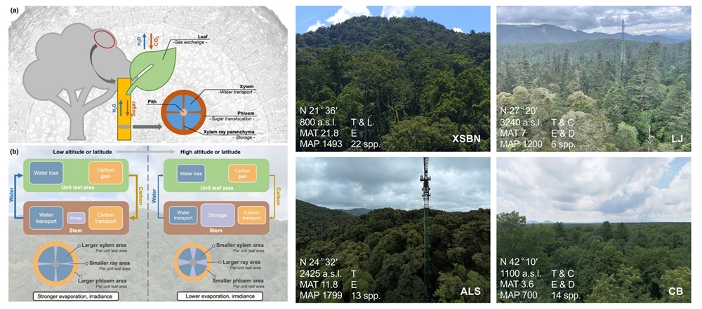 木本植物的碳水代谢依赖于复杂的维管系统网络:木质部负责将水分从根部输送到叶片,韧皮部将光合产物运输到植物各处,而射线薄壁组织则承担储存和横向运输等关键功能。这三种组织的面积与叶片面积的比例系数(即功能比例),反映了植物在水分运输、碳运输和储存功能之间的权衡。然而,过去研究多集中于木质部功能,而对韧皮部和射线薄壁组织的投资策略及其气候驱动因素知之甚少。然而,在较大地理尺度上,植物如何调整这些功能比例以适应气候的变化?此外,同一环境中共生的不同生活型植物是否存在趋同或分化的策略尚不得而知。